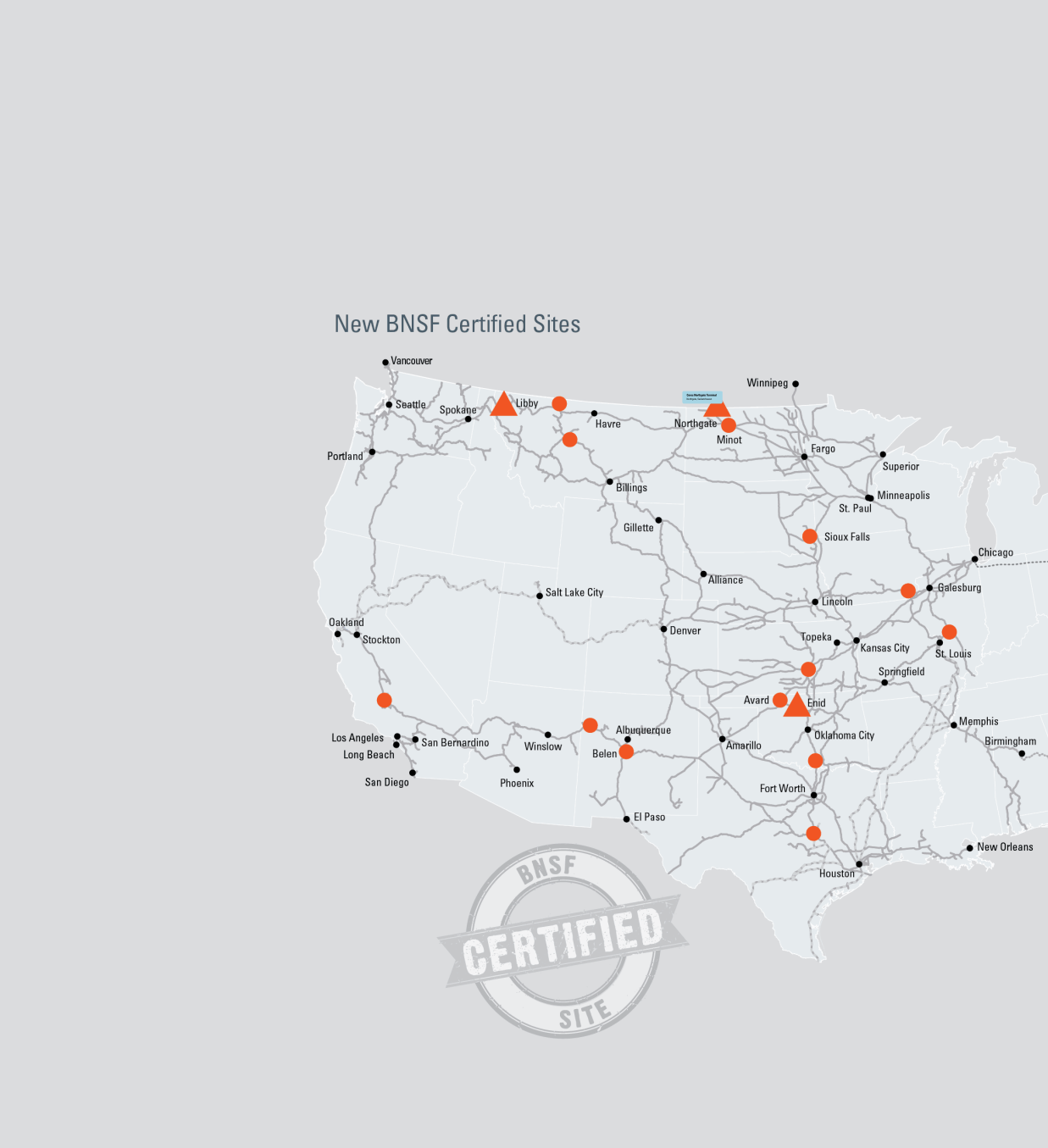 To streamline the development of rail-served sites for our customers, BNSF’s Site Certification Program selects strategically located sites across our network and makes them available for immediate development. In 2018, three new Certified Sites were added, in Oklahoma, Montana and – for the first time – in Canada. Shippers who build new rail-served facilities on a BNSF Certified Site are expected to save six to nine months of construction time as a result of the site’s advanced level of preparedness for development.